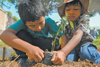 在印度尼西亞班達(dá)亞齊的一所自然小學(xué)里,學(xué)生們正在種植樹(shù)苗。