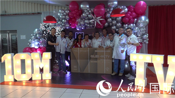 中巴員工利用午飯空閑時間一起紀(jì)念第1000萬臺電視機(jī)下線。人民網(wǎng)記者吳杰 攝