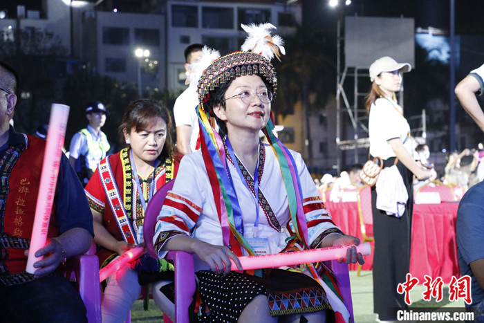 圖為4月22日晚,海南省臺聯(lián)副會長劉芳穎身著臺灣少數(shù)民族服飾出席在樂東舉行的“三月三”開幕活動。 中新社記者 朱賀 攝
