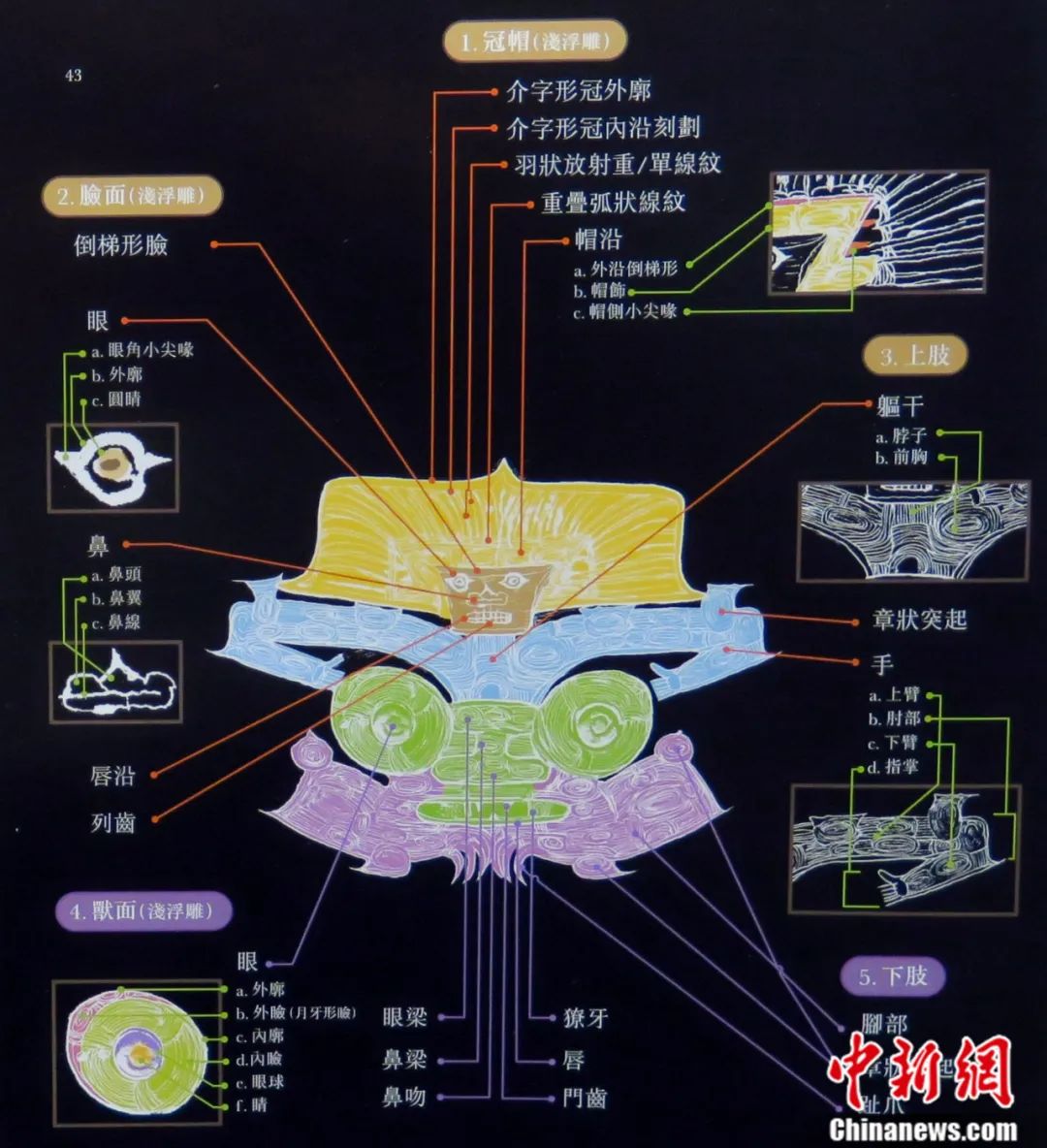 這個圖案的主體為“神人”,面部呈倒梯形,眼睛、鼻子、牙齒都非常寫實?!吧袢恕鳖^上還戴有高聳的羽冠,內(nèi)層刻有連續(xù)卷云紋的帽飾,外層為放射狀羽翎大冠?!吧袢恕钡乃闹家躁幖y細刻而成,上肢作抬臂、彎肘狀,五指平張?!吧袢恕钡纳硐率且恢环诘厣系纳瘾F(形似老虎),外框有橢圓形的眼瞼,之間以橋形凸面相連,有鼻梁和鼻翼,闊嘴內(nèi)有尖利的牙齒。