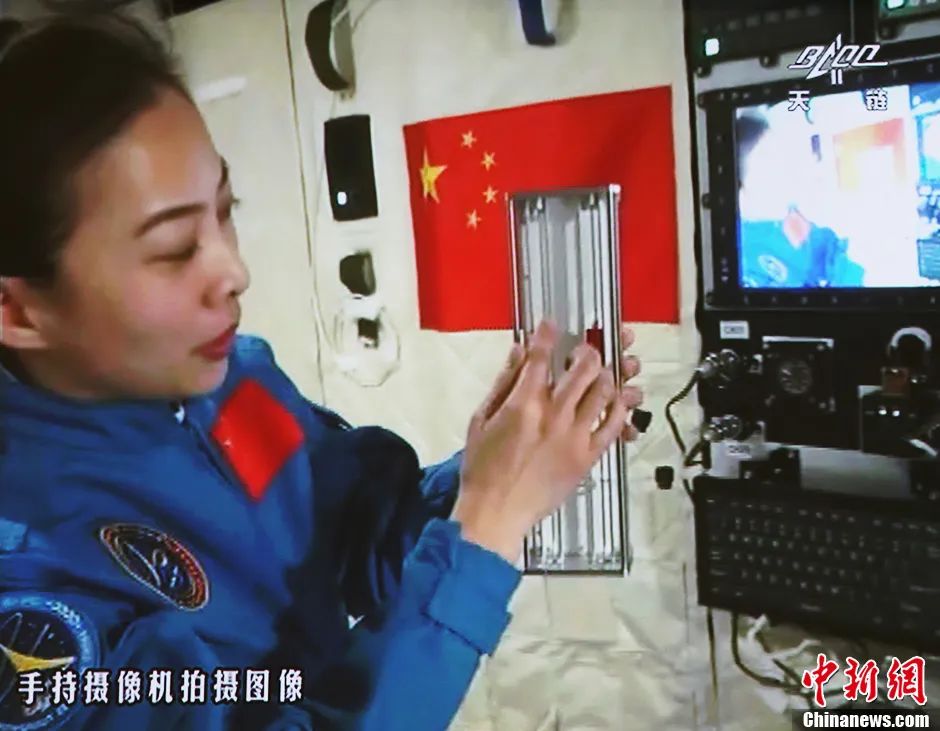 2013年6月20日10時許,神舟十號航天員在天宮一號開展基礎(chǔ)物理實驗,為青少年進行中國首次太空授課。圖為王亞平講授質(zhì)量測量。中新社發(fā) 秦憲安 攝