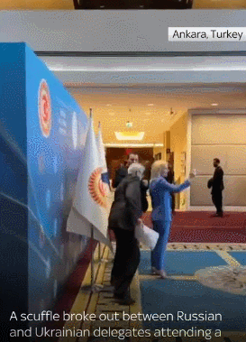 中新網(wǎng)5月5月電 綜合外媒報道,當(dāng)?shù)貢r間4日,在土耳其安卡拉舉行的黑海經(jīng)濟(jì)合作組織議會大會(PABSEC)會議間隙,俄烏代表團(tuán)成員因?yàn)橐幻鏋蹩颂m國旗扭打在了一起。