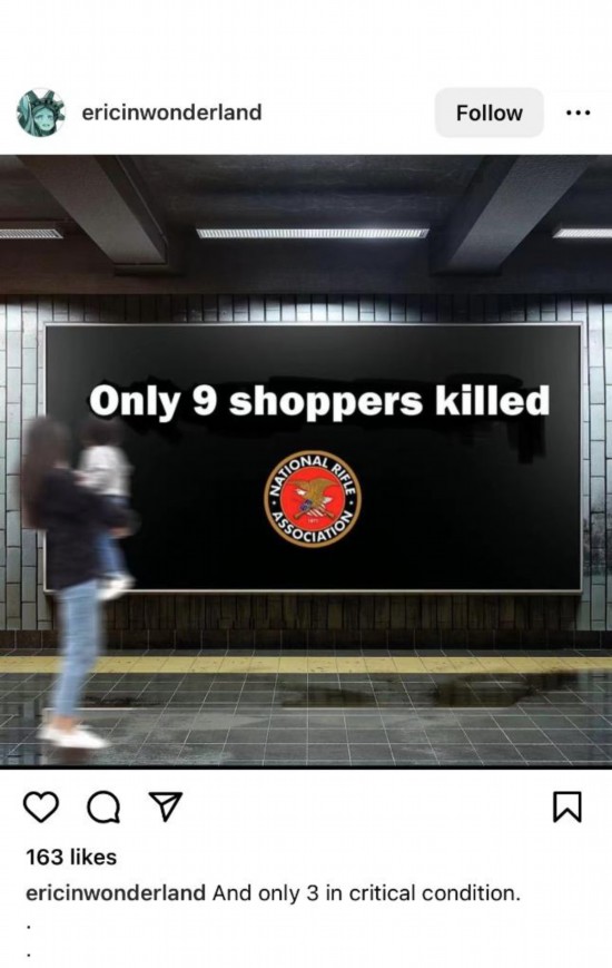 網(wǎng)友Ericinwonderland創(chuàng)作了一則帶有美國步槍協(xié)會(huì)標(biāo)識(shí)的“廣告”,上面寫道:“只死了9個(gè)。”