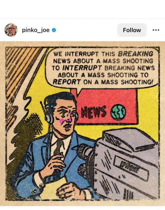 網(wǎng)友Pinko_joe的漫畫主角是一名記者,他對著鏡頭說:“下面讓我們打斷一下關(guān)于大規(guī)模槍擊的突發(fā)報(bào)道,臨時(shí)插播另一條關(guān)于大規(guī)模槍擊的突發(fā)新聞!”