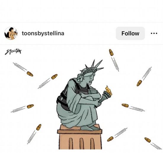 這幅漫畫顯示,面對來自四面八方的子彈,身穿防彈衣的自由女神抱著膝蓋瑟瑟發(fā)抖。