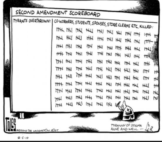 這幅漫畫題為《第二修正案“得分板”》,右邊顯示因?yàn)榈诙拚杆劳龅耐隆W(xué)生、配偶、商店售貨員等各色人等。美國憲法第二修正案是美國公民擁槍的主要法律依據(jù)。