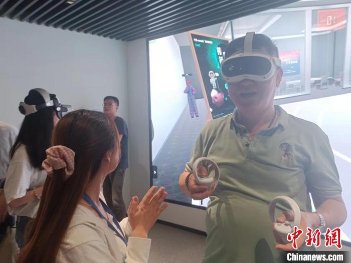 5月16日,體驗者穿戴設備,在南京維賽客網(wǎng)絡科技有限公司體驗元宇宙魅力。中新社記者 李夢 攝