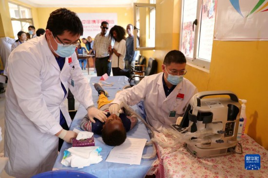 5月29日,在埃塞俄比亞首都亞的斯亞貝巴,第24批中國援埃塞醫(yī)療隊(duì)隊(duì)員為當(dāng)?shù)馗@旱膬和M(jìn)行體檢。新華社記者 汪平 攝