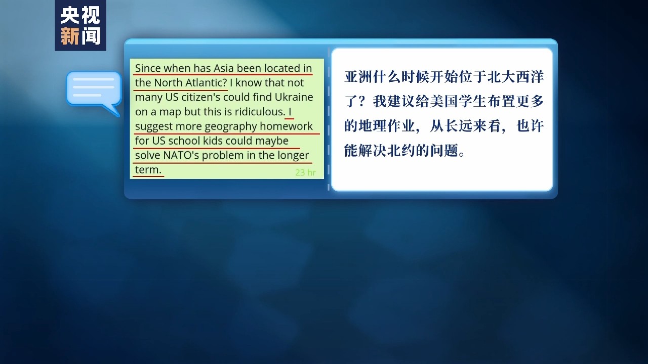 “亞洲什么時候開始位于北大西洋了?我建議給美國學生布置更多的地理作業(yè),從長遠來看,也許能解決北約的問題。”