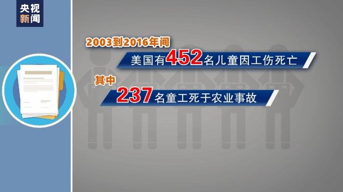 農(nóng)業(yè)領(lǐng)域是美國雇傭童工的重災(zāi)區(qū)之一。據(jù)美國非營利組織“農(nóng)場工人就業(yè)項目聯(lián)合會”提供的數(shù)據(jù),美國仍有50萬至80萬名童工在農(nóng)場工作。農(nóng)場勞作繁重、條件艱苦,童工還常被置于因天氣、農(nóng)藥及使用農(nóng)具農(nóng)機所產(chǎn)生的危險中?!度A盛頓郵報》報道,2003年至2016年間,美國有452名兒童因工傷死亡,其中237名童工死于農(nóng)業(yè)事故。