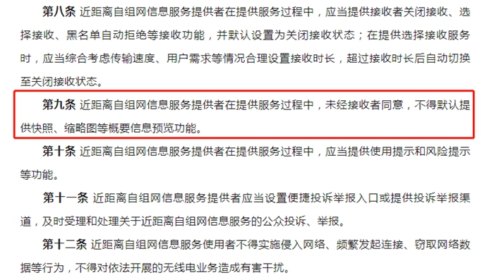 征求意見稿還提出,近距離自組網(wǎng)信息服務(wù)提供者在提供服務(wù)過程中,應(yīng)當(dāng)提供接收者關(guān)閉接收、選擇接收、黑名單自動拒絕等接收功能,并默認(rèn)設(shè)置為關(guān)閉接收狀態(tài)。(完)