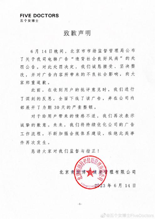 6月14日晚,“五個(gè)女博士”也在其微博發(fā)布致歉聲明稱,對(duì)此處罰決定,誠(chéng)懇接受、堅(jiān)決整改,并對(duì)廣告內(nèi)容所帶來的不良社會(huì)影響,向大家鄭重道歉。