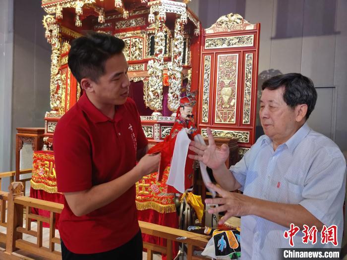 6月17日,在廈門舉行的海峽兩岸布袋木偶戲藝術(shù)節(jié)上,80歲的莊陳華(右一)正在指導(dǎo)吳聲杰(左一)表演布袋木偶戲。 中新社記者 葉秋云 攝