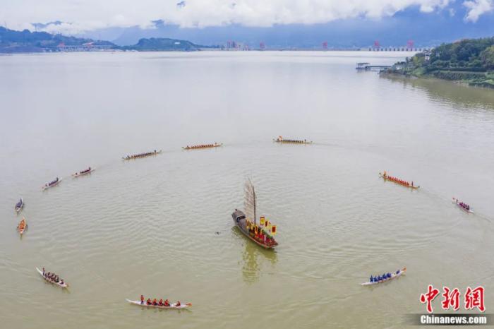 2021年10月,中國龍舟爭霸賽在湖北秭歸縣徐家沖港灣國家級龍舟訓(xùn)練基地舉行,圖為龍舟游江儀式。聶爽 攝