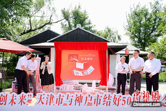 6月24日,中日嘉賓為《天津市與神戶市締結(jié)友城50周年紀念郵折》揭幕。當日,主題為“接續(xù)友好 共創(chuàng)未來”天津市與神戶市結(jié)好50周年紀念活動在天津水上公園神戶園舉行。 中新社記者 佟郁 攝