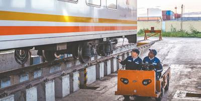 在肯尼亞內(nèi)羅畢,吳同明(左)與學(xué)員基魯姆瓦在車輛運(yùn)用車間檢查客運(yùn)車廂。2017年來(lái)到肯尼亞的中國(guó)師父吳同明是非洲之星鐵路運(yùn)營(yíng)公司機(jī)輛部車間工程師。“學(xué)員的積極主動(dòng)讓我印象深刻?!眳峭髡f(shuō)?;斈吠哒f(shuō):“未來(lái)希望更多的中國(guó)老師來(lái)到肯尼亞,與我們一同推動(dòng)基礎(chǔ)設(shè)施建設(shè)?!?/p>