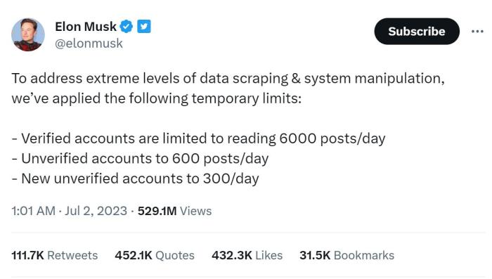 馬斯克發(fā)文稱,“為了解決極端水平的數(shù)據(jù)抓取和系統(tǒng)操縱問題,我們采取了以下臨時(shí)限制:認(rèn)證帳戶每天只能閱讀6000個(gè)帖子,未認(rèn)證的帳戶每天能看600個(gè)帖子;新的未認(rèn)證的帳戶每天能看300個(gè)帖子。”