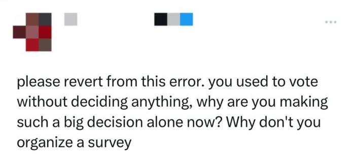 有網(wǎng)友呼吁,“請(qǐng)改正這個(gè)錯(cuò)誤。你以前在投票時(shí)都不做出任何決定,為什么現(xiàn)在要獨(dú)自做出這么大的決定?你為什么不組織一次調(diào)查。”