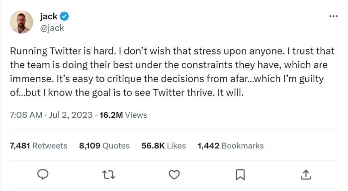 推特聯(lián)合創(chuàng)始人、前首席執(zhí)行官杰克·多爾西隨后發(fā)表了對(duì)此事的看法,他表示,“運(yùn)營推特是很困難的。我不希望任何人受到這種壓力。我相信這個(gè)團(tuán)隊(duì)在巨大的限制條件下,正在盡最大努力。從遠(yuǎn)處批評(píng)這些決定是很容易的……我也對(duì)此感到歉疚……但我知道他們的目標(biāo)是要看到推特的繁榮。它會(huì)的?!?/p>