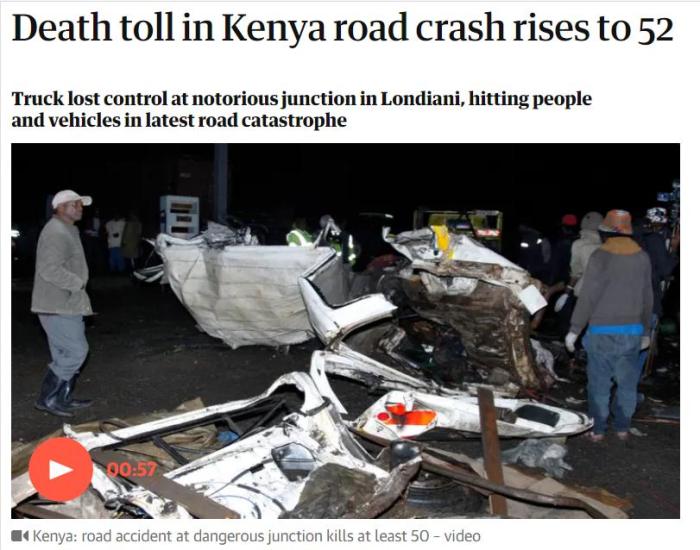 穆爾科門在一份聲明中表示,死亡人數(shù)為52人,另有32人受傷,并補(bǔ)充說,肇事卡車的注冊地是盧旺達(dá)。肯尼亞媒體報(bào)道稱,肇事車輛的司機(jī)已經(jīng)死亡,但法新社稱,這一消息無法立即得到證實(shí)。