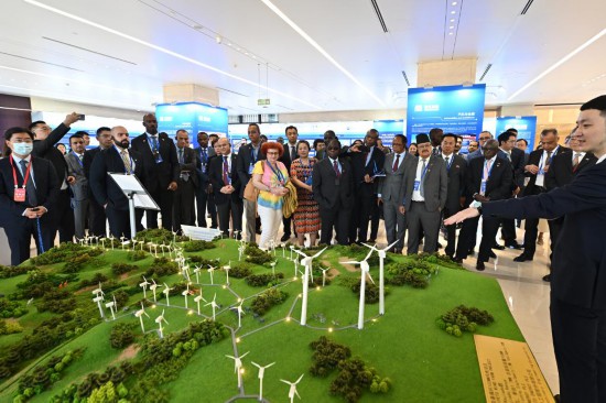 7月6日,駐華使節(jié)在國機集團國際化經營成果展廳內參觀由該集團承建的肯尼亞基佩托風電項目沙盤。新華社記者 李鑫 攝