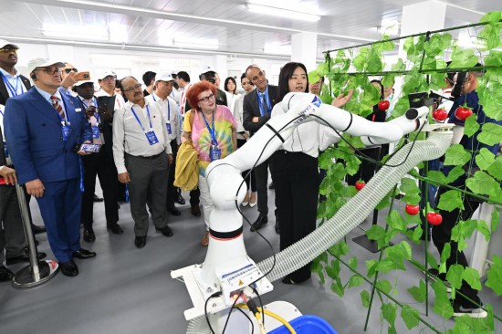 7月6日,駐華使節(jié)在國機集團中國農機院觀看番茄采摘機器人作業(yè)演示。新華社記者 李鑫 攝