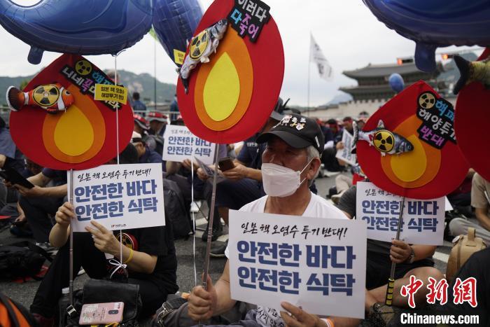 當(dāng)?shù)貢r間7月8日,韓國多個市民團(tuán)體和在野黨在首爾集會,抗議日本強(qiáng)推核污染水排海計劃?!≈行律缬浾?劉旭 攝
