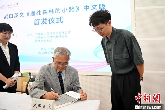 2023年7月8日,武田英文著作《通往森林的小路》中文版首發(fā)儀式在蘭州舉行。圖為武田英文給現場嘉賓簽名?!≈行律缬浾?九美旦增 攝