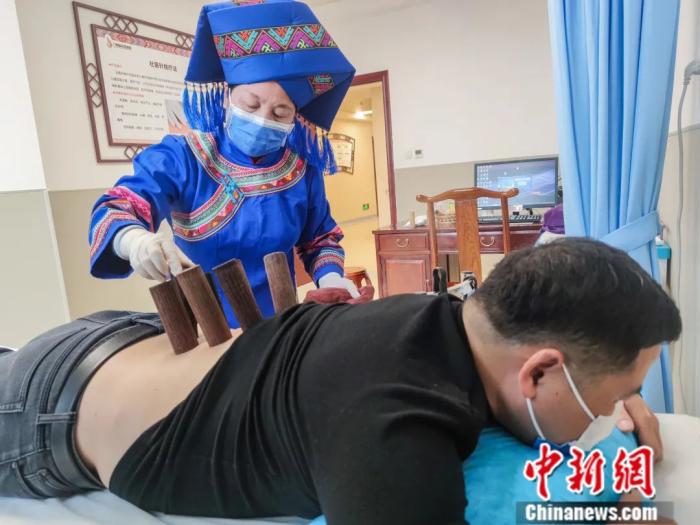 南寧市廣西國際壯醫(yī)醫(yī)院民族醫(yī)療特色診療中心,壯醫(yī)醫(yī)師為病人進(jìn)行藥物竹罐療法。陳冠言 攝