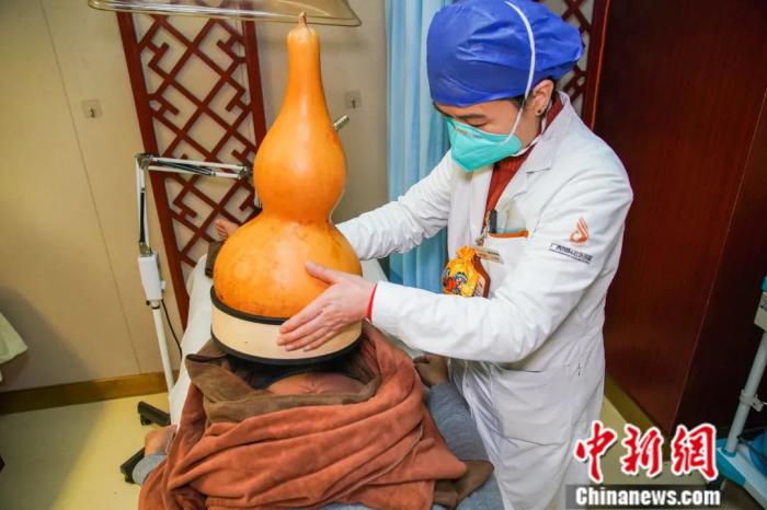 南寧市廣西國際壯醫(yī)醫(yī)院民族醫(yī)療特色診療中心,壯醫(yī)醫(yī)師為進(jìn)行壯醫(yī)天陰陽臍環(huán)穴針法治療的患者蓋上艾灸葫蘆。陳冠言 攝
