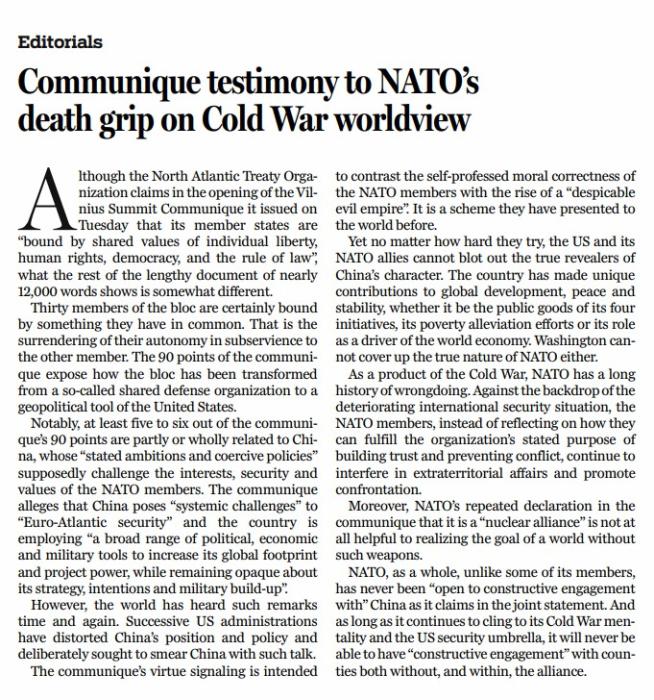 北約維爾紐斯峰會7月11日發(fā)表萬字公報,冠冕堂皇地宣稱“堅守個人自由、人權、民主和法治等共同價值觀”,實際上充斥著冷戰(zhàn)思維,炫耀武力,抹黑和攻擊他國。