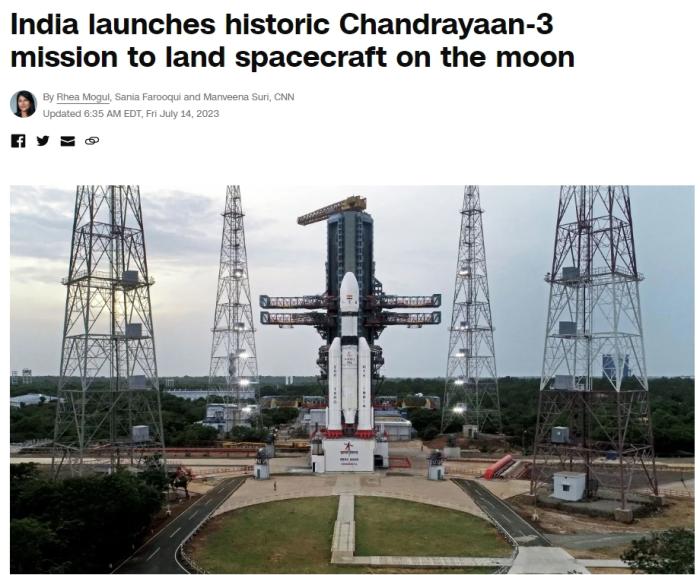 中新網7月14日電 據美國有線電視新聞網(CNN)報道,當地時間14日下午,印度“月船3號”月球探測器發(fā)射升空。報道稱,如果該月球探測器8月著陸成功,印度將成為第4個在月球表面軟著陸的國家。