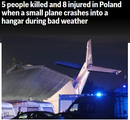 據(jù)報道,當(dāng)天,波蘭國家消防局發(fā)言人莫妮卡·諾瓦科斯卡·布林達(Monika Nowakowska-Brynda)表示,“波蘭中部的克辛諾(Chrcynno)地區(qū),受惡劣天氣影響,一架塞斯納型飛機在降落時墜入跳傘中心的機庫,事發(fā)時有10人在機庫中,飛行員和在機庫中躲避暴風(fēng)雨天氣的4名人員遇難。”