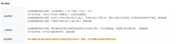 19日,記者瀏覽某在線旅游平臺的多個(gè)跟團(tuán)游頁面,發(fā)現(xiàn)在預(yù)訂限制一欄中,會有年齡限制、人群限制和其他限制。但多是不接受孕婦預(yù)訂,并未有記者等職業(yè)限制。