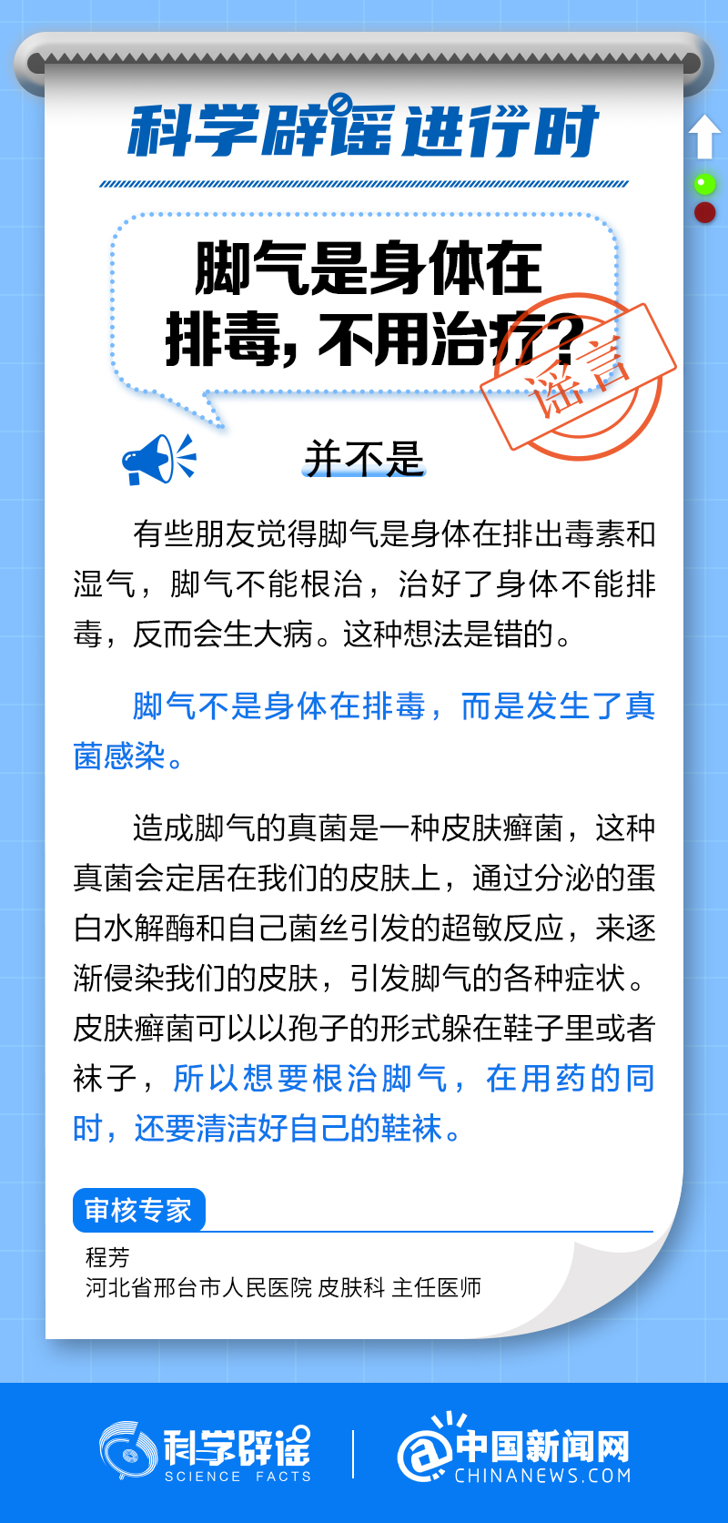 有些朋友覺得腳氣是身體在排出毒素和濕氣,腳氣治好了身體不能排毒,反而會生大病。這種想法是錯的!腳氣不是身體在排毒,而是發(fā)生了真菌感染。(來源:@科學辟謠 @中國新聞網(wǎng) )