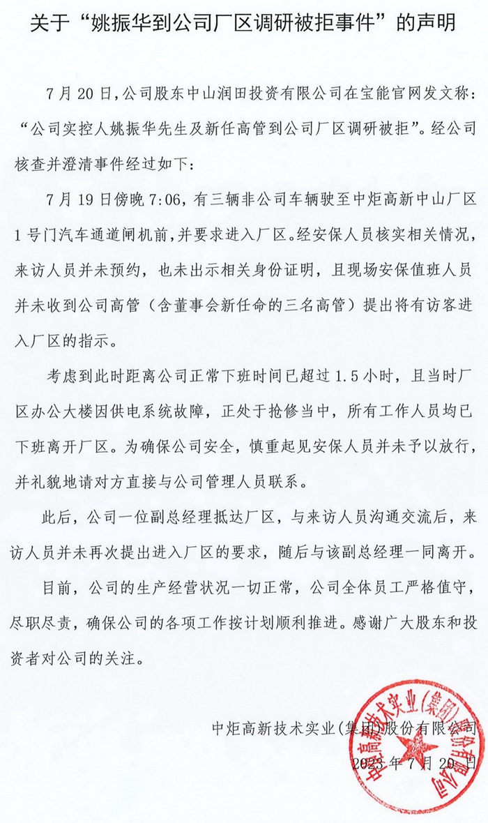 近日,“寶能系”股東中山潤(rùn)田在寶能集團(tuán)官網(wǎng)發(fā)布聲明稱,寶能集團(tuán)董事長(zhǎng)姚振華得知中炬高新日常管理工作出現(xiàn)重大紕漏的相關(guān)情況后,非常擔(dān)憂上市公司的生產(chǎn)安全及食品安全問題,趕往中山中炬高新總部,調(diào)研生產(chǎn)經(jīng)營(yíng)情況。未曾想,竟被保安拒絕進(jìn)入。