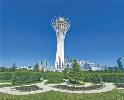多年來(lái),中國(guó)與哈薩克斯坦合作為哈首都阿斯塔納生態(tài)圈打造生態(tài)屏障。圖為阿斯塔納城市象征——生命之樹,在其觀景平臺(tái)上可俯瞰阿斯塔納全景。