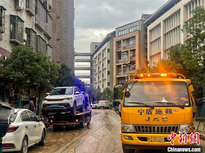 沿著中心街道往里走,越往里,積水退去后的殘留淤泥越多。街道兩側,不時可看見堆放著不少被積水浸泡過后、無法使用的家具、生活用品以及貨物等,救援車將一部部受損車輛拖離現(xiàn)場。