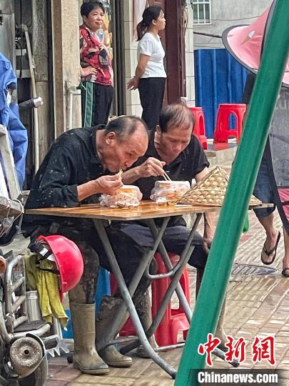 村中,七旬的吳大爺和數(shù)名年齡相近的村民,已自發(fā)幫助清理村中街道長達11個小時。17時許,吳大爺在街邊攤位吃著面條,稍作歇息后,他將重新投入清理工作。