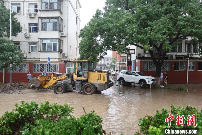 8月1日,北京市門(mén)頭溝區(qū)橋東街,工程車輛在街道清淤。 中新社記者 盛佳鵬 攝