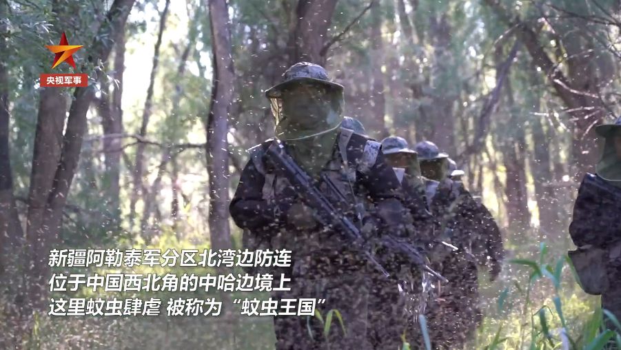 新疆阿勒泰軍分區(qū)北灣邊防戰(zhàn)士穿行蚊子群巡邏。一路上數(shù)以萬(wàn)計(jì)的蚊子、蠓蟲撲面而來。圖片來源:央視軍事視頻截圖