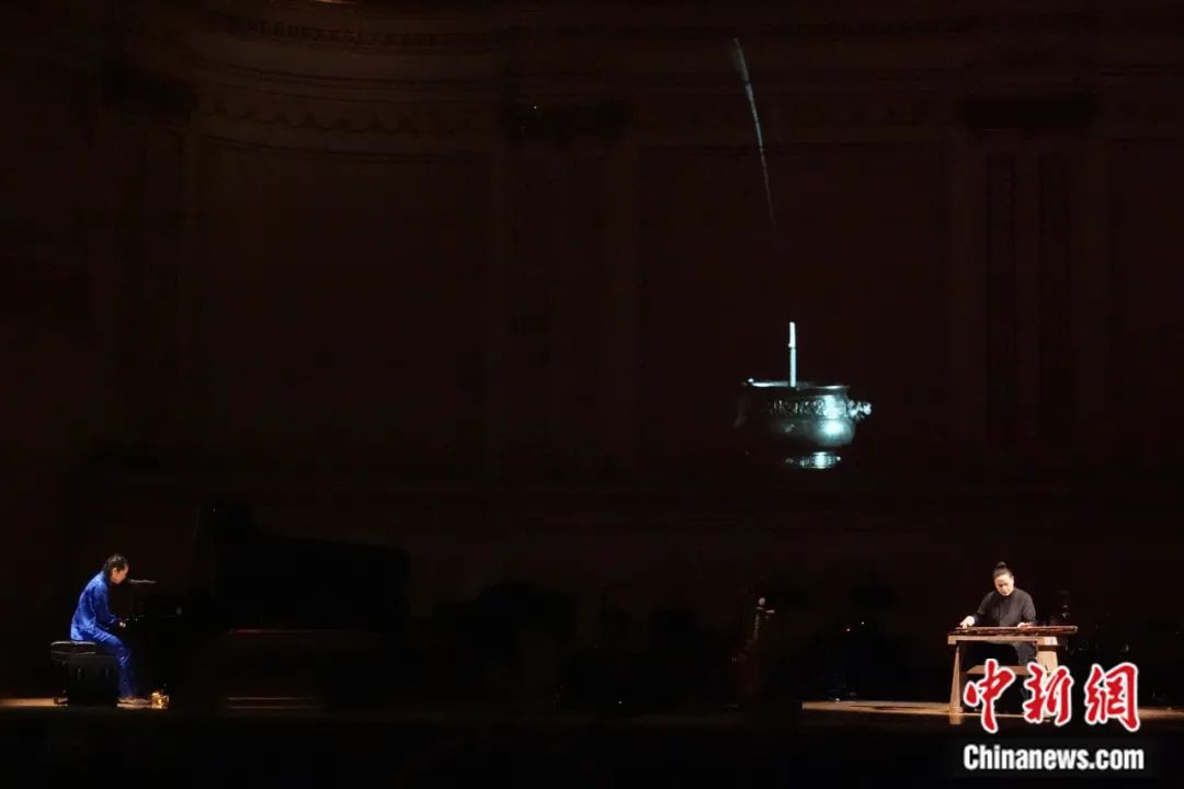 2023年7月1日,“紐約中美青年音樂節(jié)”在美國紐約卡內(nèi)基音樂廳舉行,來自中國和美國的青年音樂人演奏新國樂、實(shí)驗(yàn)世界音樂、實(shí)驗(yàn)民謠、新爵士樂,吸引當(dāng)?shù)赜^眾聆聽。圖為音樂人巫娜(右)與李帶菓以古琴和鋼琴演奏新國樂。廖攀 攝