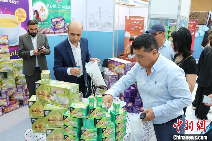 當(dāng)?shù)貢r(shí)間8月3日,哈薩克斯坦阿斯塔納,阿富汗商品展當(dāng)日啟幕。圖為阿富汗茶葉展位吸引當(dāng)?shù)仡櫩婉v足。 中新網(wǎng)記者 張碩 攝