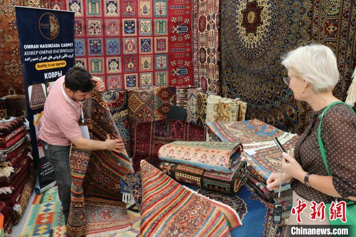 當(dāng)?shù)貢r(shí)間8月3日,哈薩克斯坦阿斯塔納,阿富汗商品展當(dāng)日啟幕。圖為展商向哈顧客展示阿富汗手工羊毛地毯?! ≈行戮W(wǎng)記者 張碩 攝