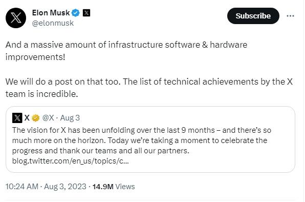 2023年4月,馬斯克將推特的法定名稱更改為“X”。