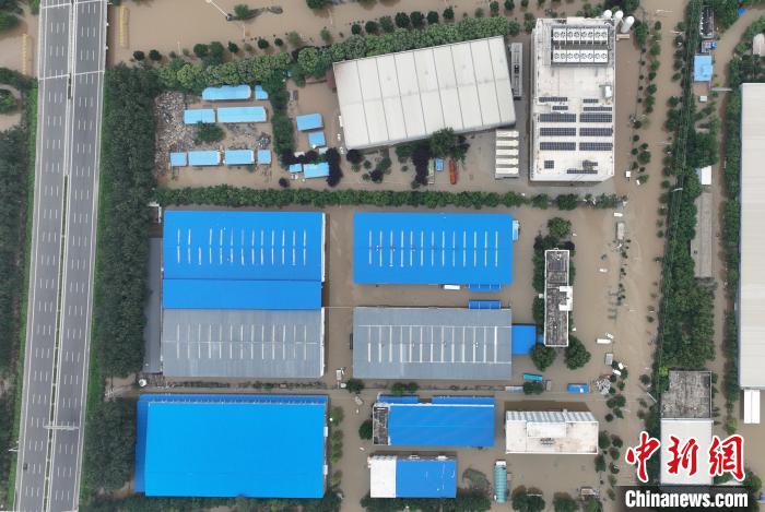 8月5日,中圖網(wǎng)倉(cāng)儲(chǔ)中心所在區(qū)域依然有大量積水。(無人機(jī)照片)中新社記者 韓冰 攝