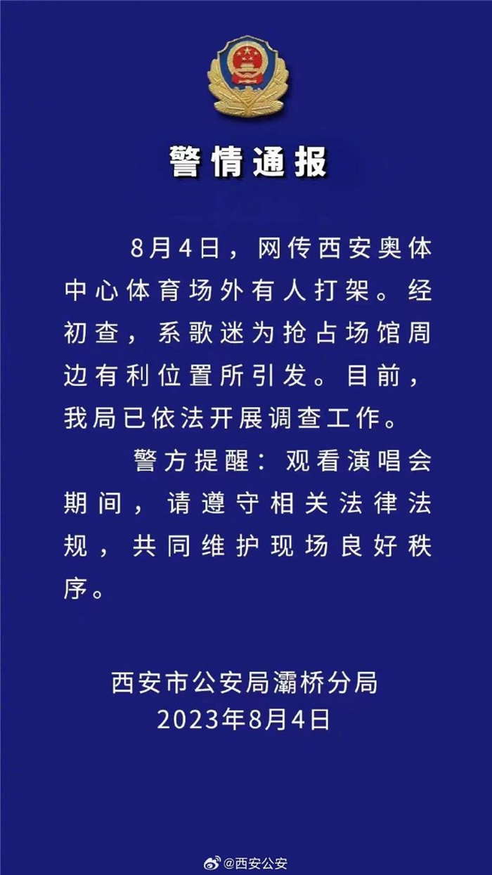 通報稱,經(jīng)初查,此事系歌迷為搶占場館周邊有利位置所引發(fā)。目前,公安局已依法開展調(diào)查工作。
