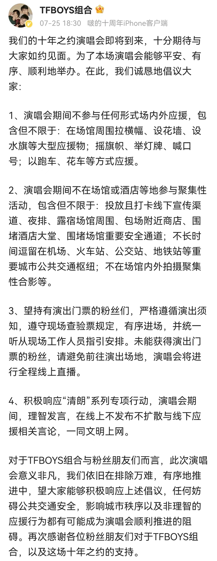 TFBOYS十年之約演唱會倡議。來源:TFBOYS官微。