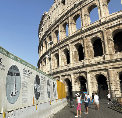 在意大利羅馬熱門景點(diǎn)斗獸場(chǎng),游客正在閱讀帶有中文解說的標(biāo)識(shí)牌。