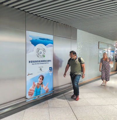 希臘雅典國(guó)際機(jī)場(chǎng)內(nèi),旅客走過用中文書寫的廣告海報(bào)。